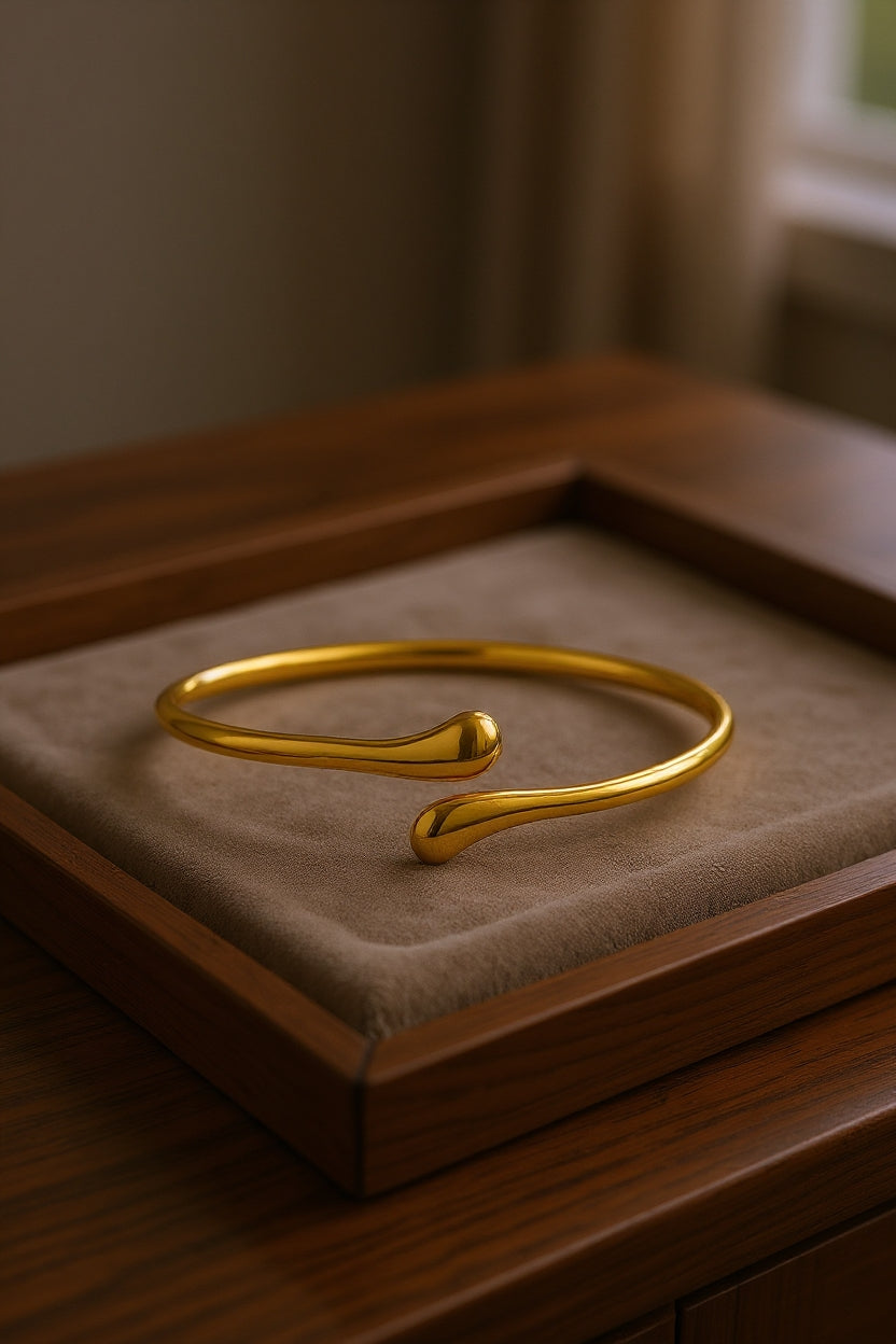 A refined bangle featuring a smooth drop-shaped accent, designed to reflect quiet elegance. Its clean lines and subtle curve make it perfect for everyday wear or effortless layering.